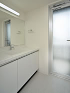 ワイドミラーの洗面室はすっきりと
